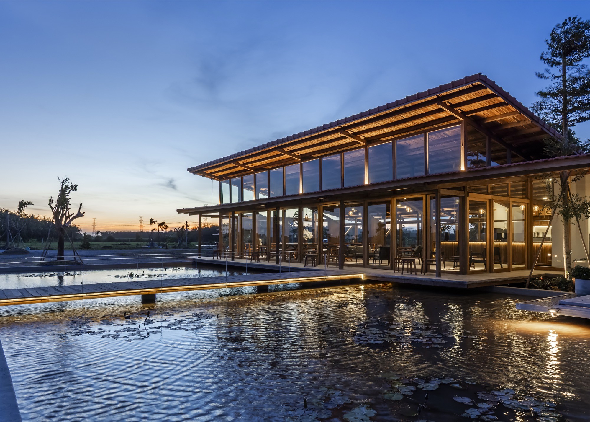 Hồ hoa súng bao bọc công trình, hoạt động như lớp đệm vi khí hậu.