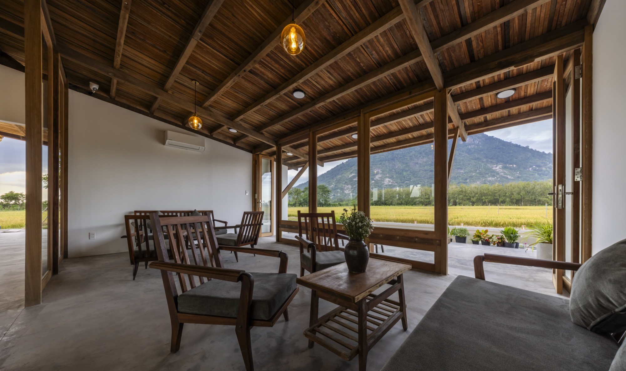 Hương Lúa Café nằm dưới chân núi Bà Đen (Tây Ninh), giữa một khu đất canh tác rộng lớn với ruộng lúa và cảnh quan nông nghiệp đặc trưng. Công trình có quy mô 875 m², là hạng mục đầu tiên trong tổ hợp nghỉ dưỡng nông nghiệp khoảng 70.000 m² dự kiến phát triển theo nhiều giai đoạn.