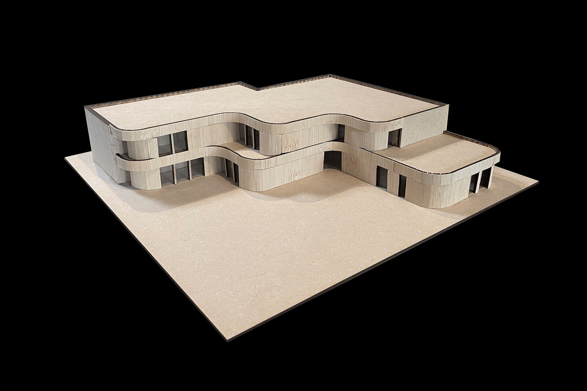 Phía sau, công trình được định hình quanh tán cây cổ thụ. Khối nhà uốn cong, mở ra những góc sân nhỏ phù hợp từng nhóm tuổi. Bao bọc toàn bộ là lớp gỗ ấm, giúp sân sau giống một quảng trường nhỏ hơn là sân trường truyền thống.
