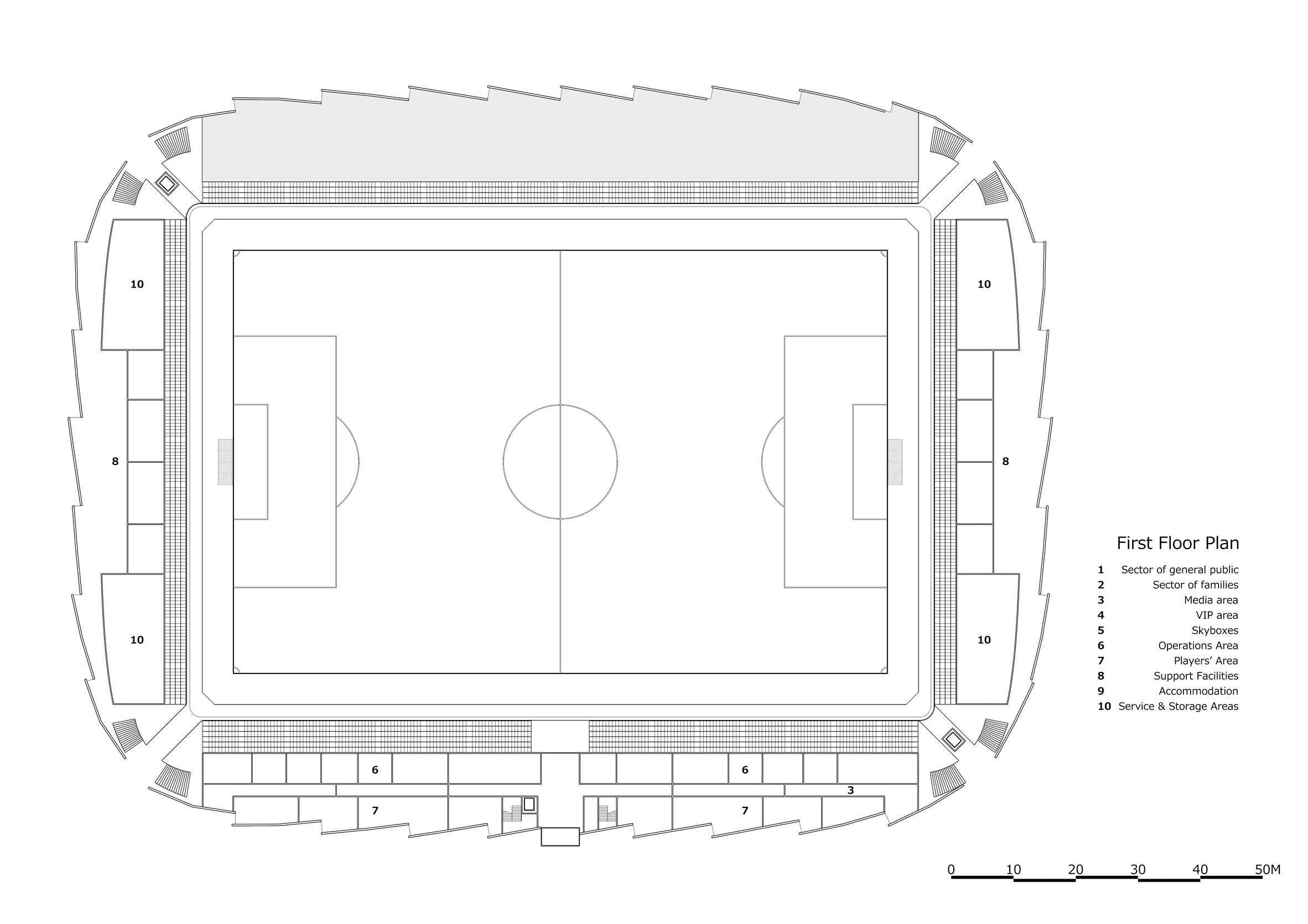 Công trình được thiết kế gồm hai tầng với mái gỗ gợn sóng liên tục, tạo nên diện mạo mềm mại, giàu nhịp điệu, hòa hợp với cảnh quan xung quanh. Toàn bộ sân vận động được chia thành bốn khối kết cấu gỗ liên kết linh hoạt, bao gồm vỏ gỗ, giàn và tường ngoài làm từ gỗ dán địa phương. Mỗi khối có diện tích dưới 3.000 m², giúp công trình tránh bị xếp vào hạng mục công trình chống cháy đặc biệt, nhờ đó tối ưu hóa chi phí và quy trình cấp phép. Mỗi phần kết cấu được thiết kế có thể tháo rời và tái sử dụng, thúc đẩy chu trình tuần hoàn vật liệu – một hướng đi mang tính tiên phong trong kiến trúc bền vững Nhật Bản. Điểm đặc biệt nữa là cộng đồng địa phương sẽ trực tiếp tham gia lắp ráp cùng các thành viên câu lạc bộ bóng đá. Quá trình này được Vuild mô tả như một “lễ hội kiến tạo hy vọng”, nơi mỗi thanh gỗ được đặt lên bằng niềm tin và lòng tự hào của người dân Fukushima.