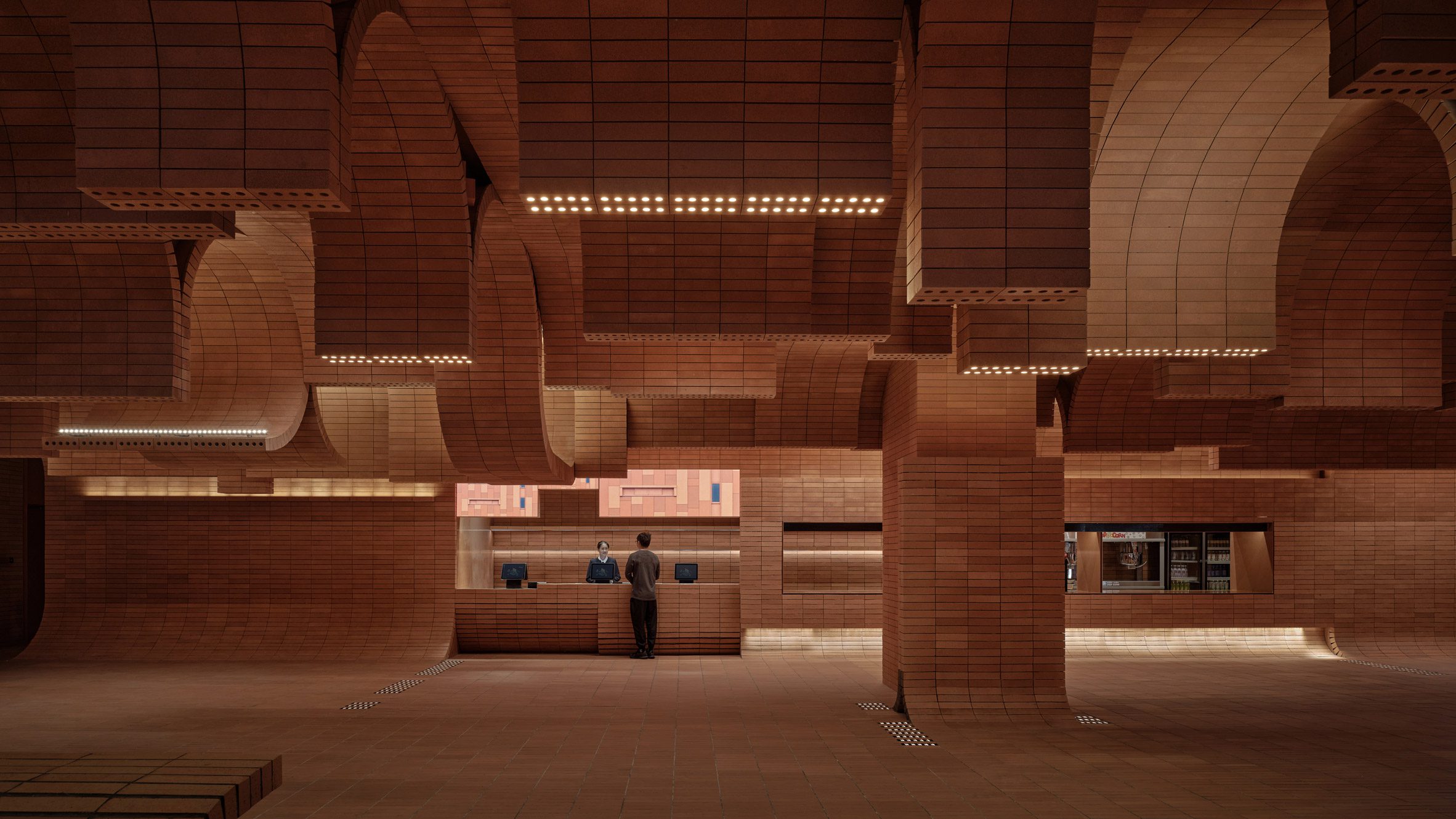 Rạp chiếu phim Gaoxingli Insun mang đến trải nghiệm điện ảnh khác biệt khi lấy cảm hứng từ chính đại dương bao quanh. Nhưng thay vì chọn gam xanh quen thuộc, công trình được bao phủ bởi những lớp gạch đỏ – chất liệu từ cát bãi biển, vừa gần gũi, vừa trường tồn. Từng viên gạch được sắp xếp như những con sóng nối tiếp, tạo nên một không gian vừa sống động, vừa gợi cảm giác vĩnh hằng, khiến người bước vào có cảm giác như đang đi trong “biển gạch” của riêng hòn đảo Haikou.
