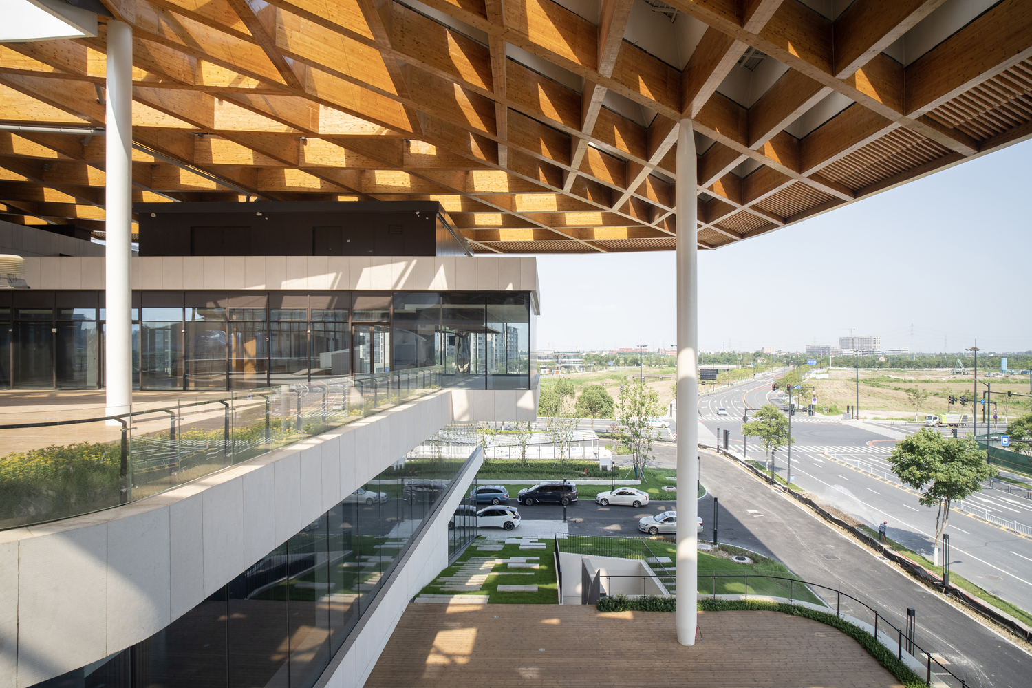 Mái lớn lấy cảm hứng từ mái hiên truyền thống Trung Hoa, được diễn giải bằng đường cong đương đại. Hệ mái giúp che nắng, khuếch tán ánh sáng tự nhiên và nâng cao tiện nghi nhiệt cho các không gian công cộng.