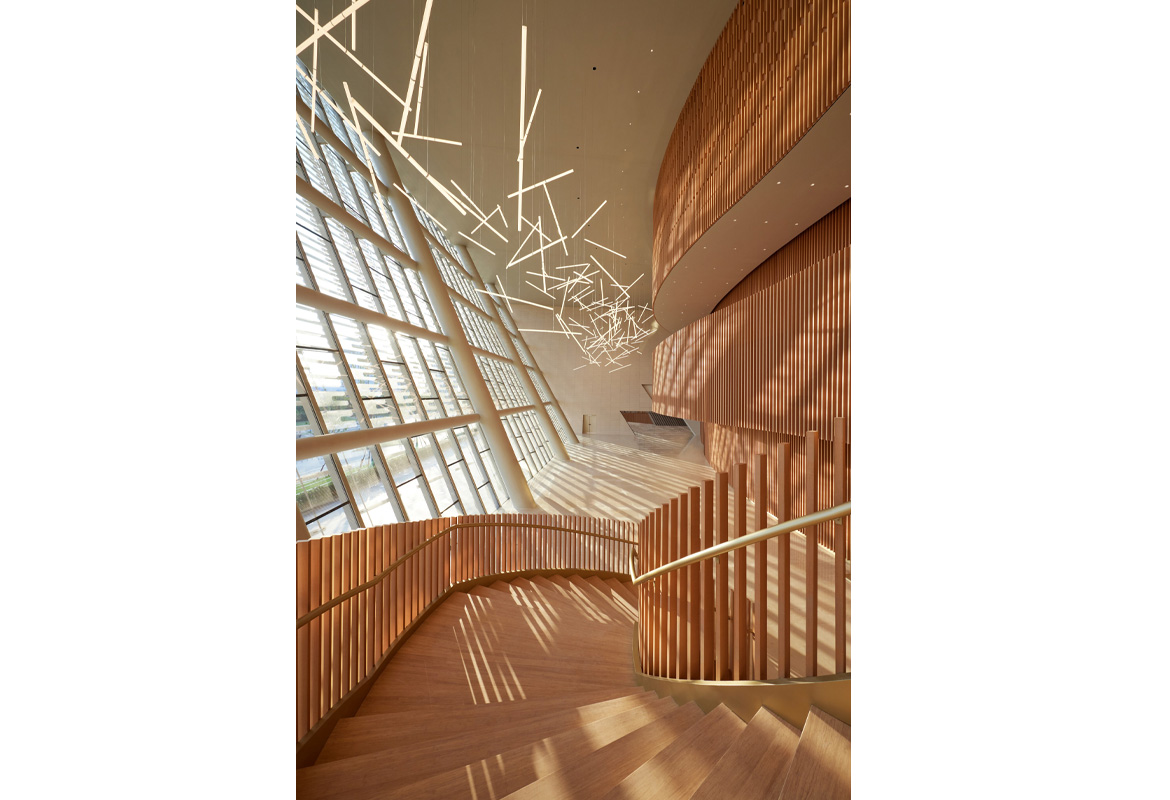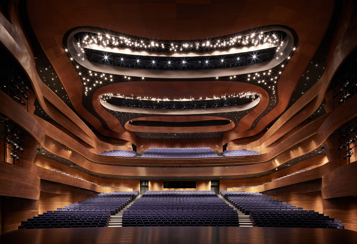 Phòng Opera với các bề mặt uốn lượn từ các ốp tre đan sợi màu sẫm | Ảnh: PES-Architects.