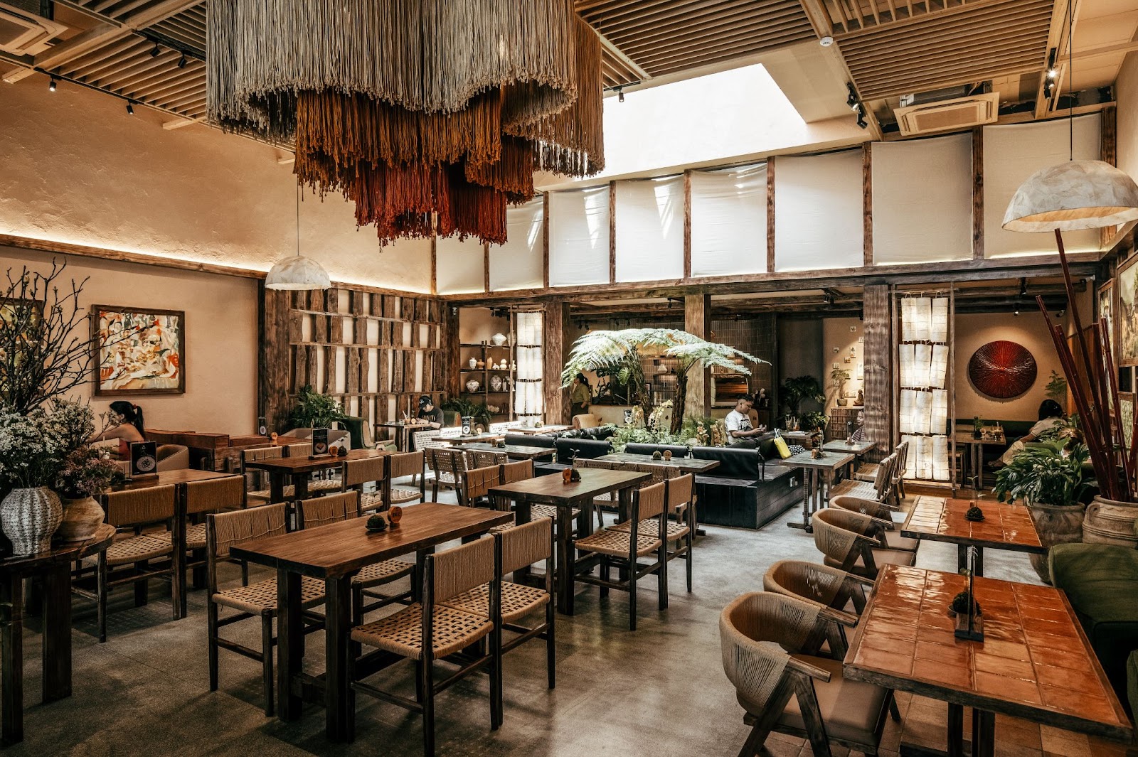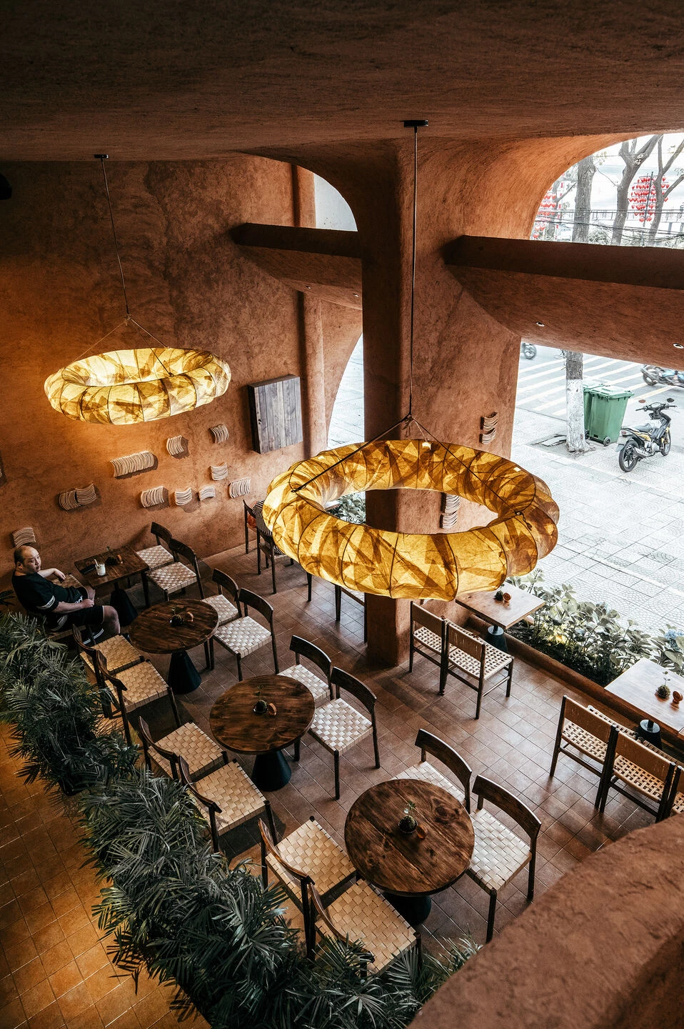 Ánh sáng & màu sắc: Gam nâu đất, vàng ấm và chất liệu tự nhiên tạo nên không gian hoài cổ nhưng tinh tế, phù hợp trải nghiệm ẩm thực – thư giãn.