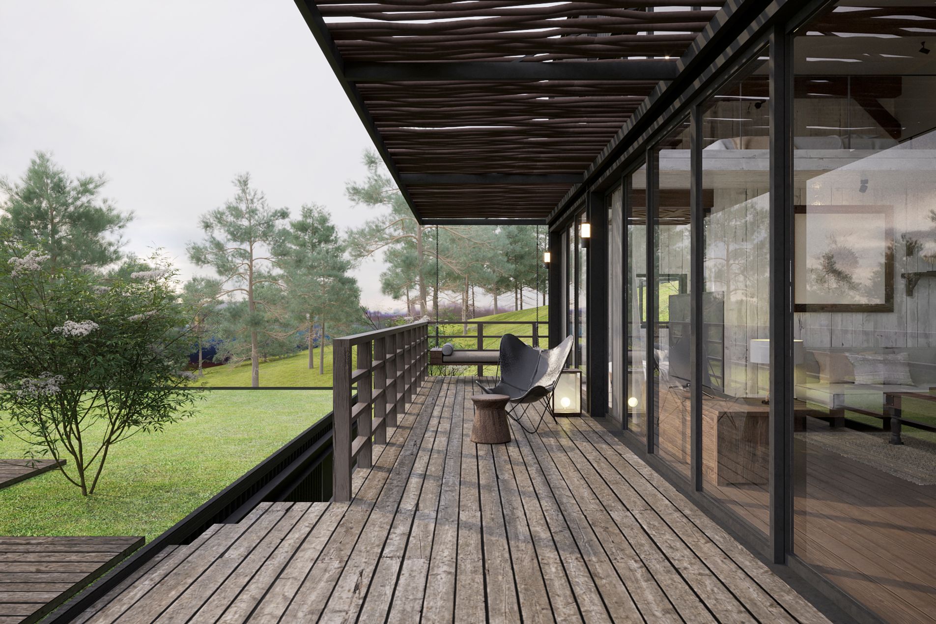 Một chi tiết quan trọng là tổ chức hiên và khoảng trống. Các deck gỗ, hiên che và khoảng đệm đóng vai trò giảm bức xạ trực tiếp, đồng thời tạo nên những lớp không gian chuyển tiếp – nơi con người đi qua thiên nhiên trước khi bước vào nhà. Điều này giúp không gian sống nhẹ nhàng, dễ chịu quanh năm.