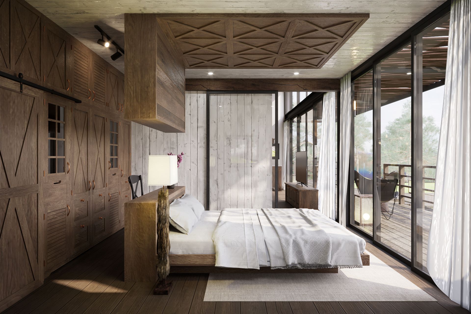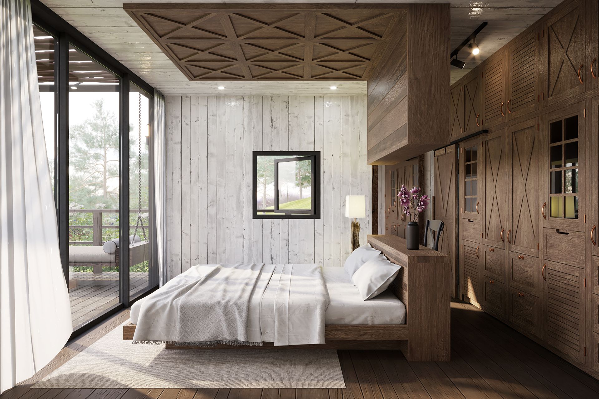 Các phòng ngủ được bố trí kín đáo hơn, đảm bảo riêng tư, nhưng không mất đi sự kết nối với cảnh quan nhờ hệ cửa kính trượt mở ra vườn. Bố cục này vừa cân bằng sự riêng tư cần thiết, vừa duy trì được triết lý chan hòa thiên nhiên.