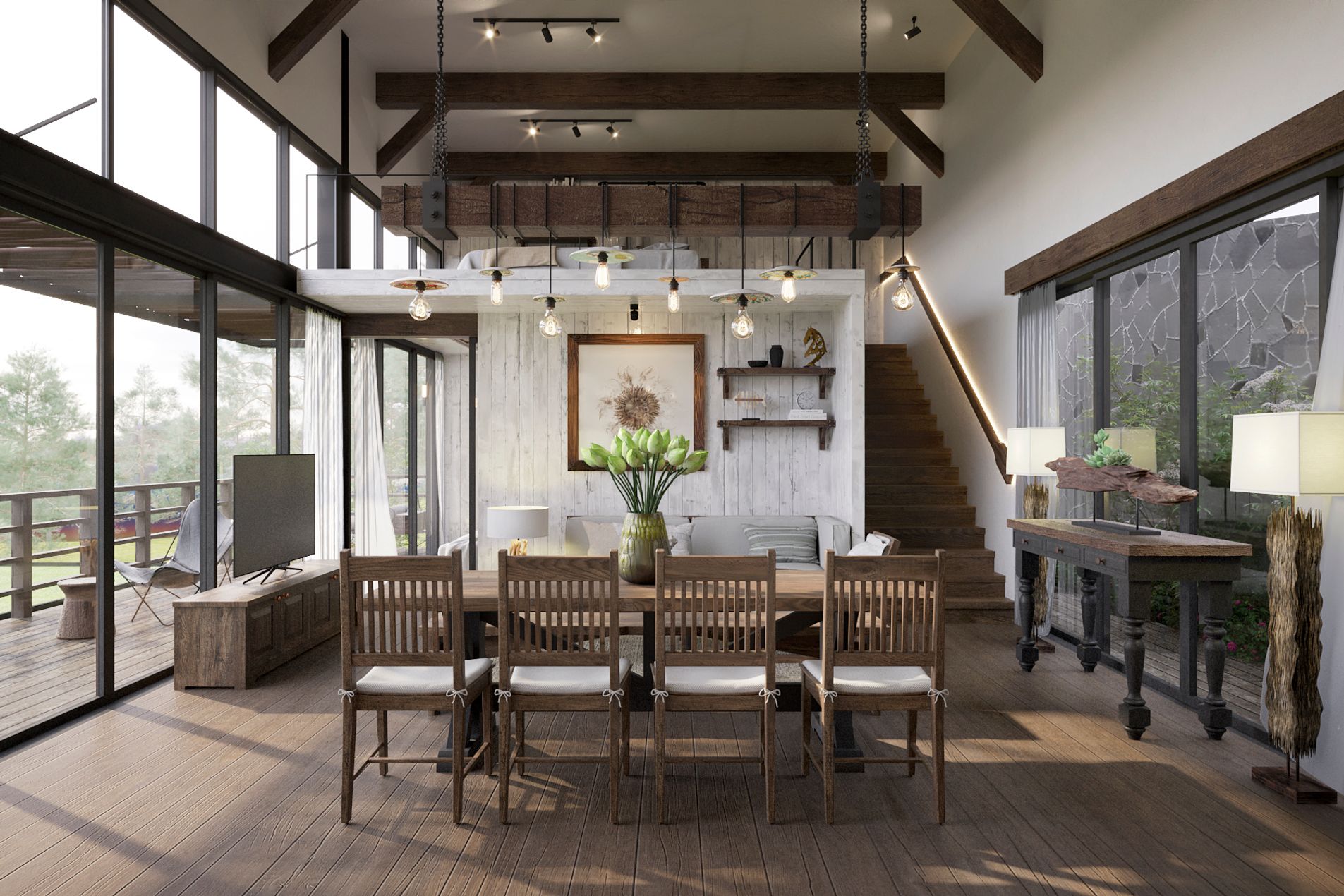 Ngoài ra, deck gỗ và sân ngoài trời đóng vai trò như “phòng khách mở rộng”. Đây là không gian cho những bữa tiệc nhỏ, ngồi bên lửa trại hay đơn giản là thả mình vào thiên nhiên. Sự cân bằng giữa không gian trong – ngoài này làm cho công trình luôn sống động, giàu trải nghiệm.