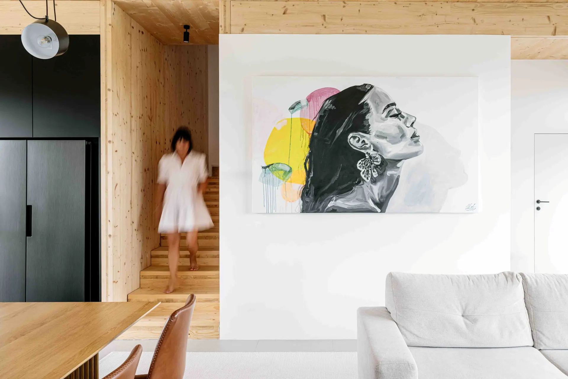 Nội thất Emília ưu tiên vật liệu tự nhiên và tông màu sáng. Phần lớn bề mặt CLT được giữ nguyên, chỉ một số mảng tường tại khu sinh hoạt được sơn trắng nhằm tăng khả năng phản xạ ánh sáng và mở rộng cảm giác không gian.