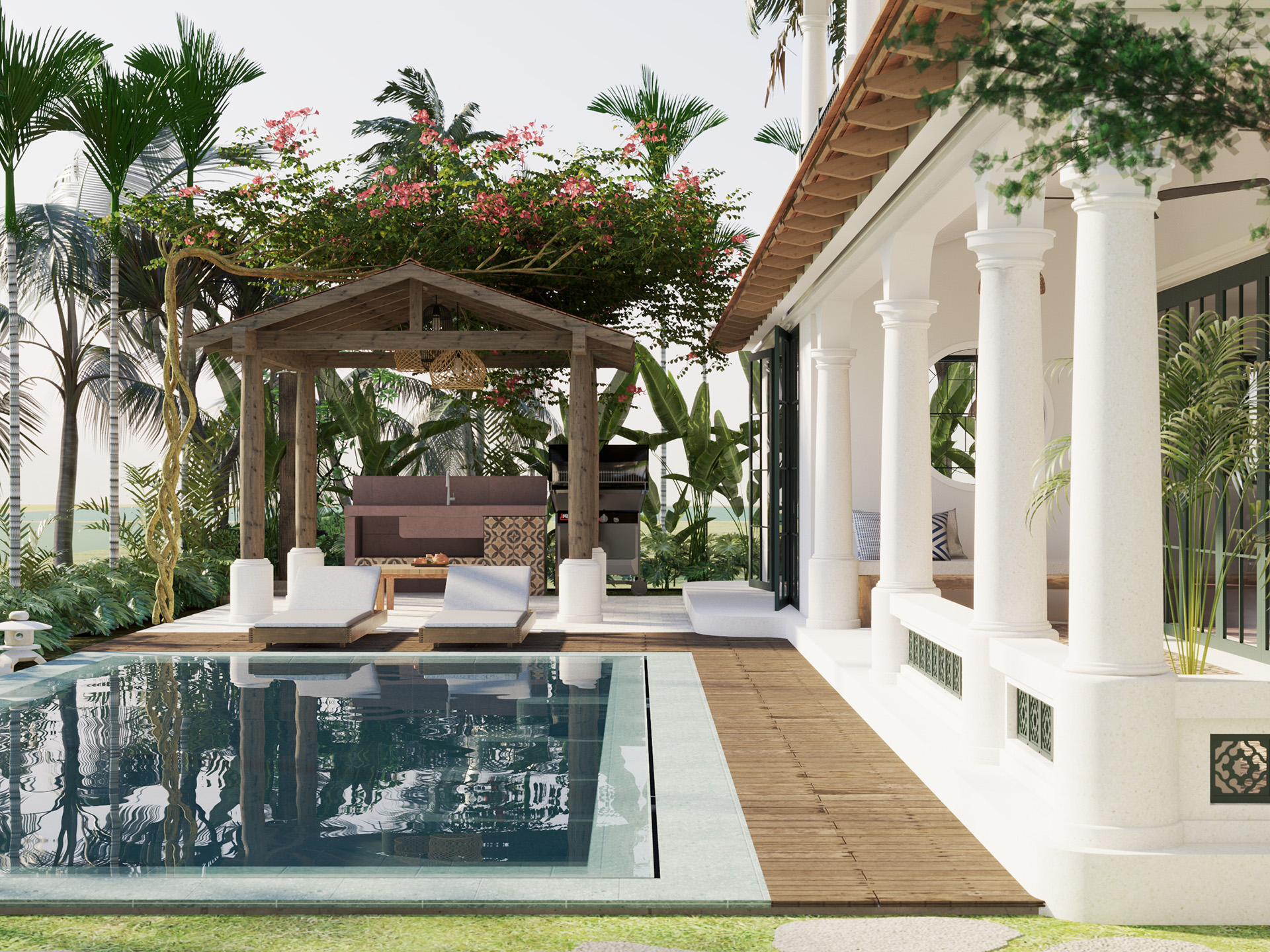 Xuất phát từ mong muốn tạo dựng một không gian nghỉ ngơi nhưng vẫn gần gũi với thiên nhiên, KTS lựa chọn ngôn ngữ mộc mạc kết hợp một vài chi tiết Colonial. Ngôi nhà vừa mang vẻ thân thuộc của làng quê, vừa tinh tế, tiện nghi cho sinh hoạt hiện đại.