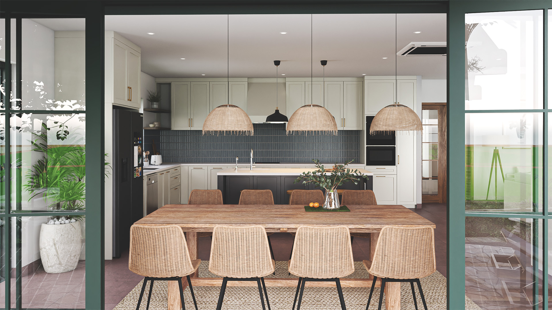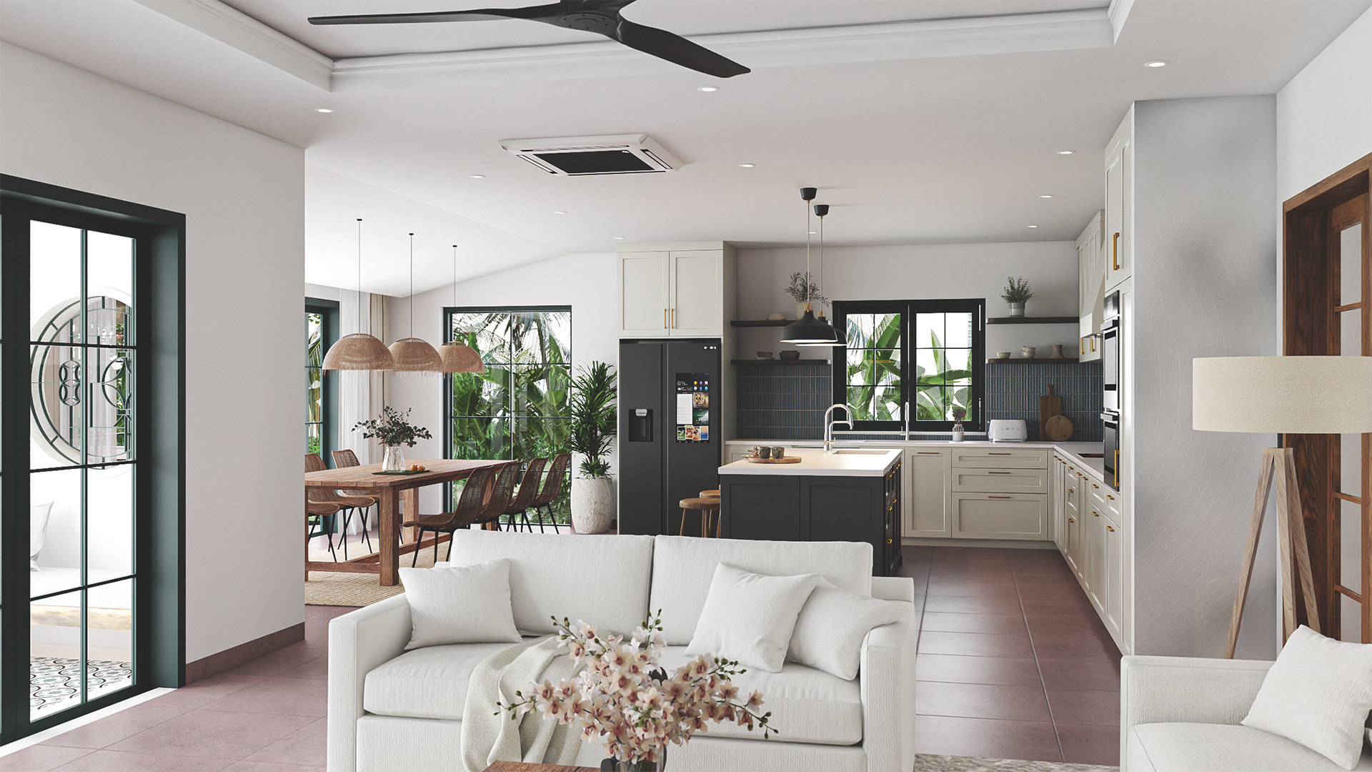 Phòng khách & bếp được bố trí như “trái tim” của ngôi nhà, mở rộng tầm nhìn ra cánh đồng, giúp mọi hoạt động thường nhật luôn gắn liền với thiên nhiên.