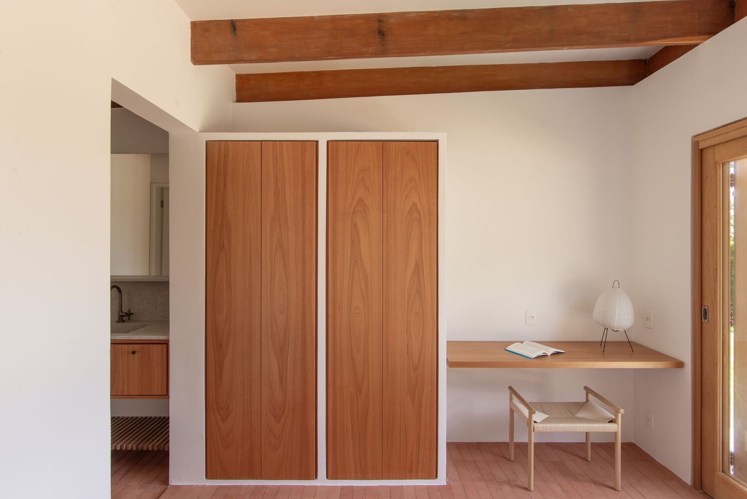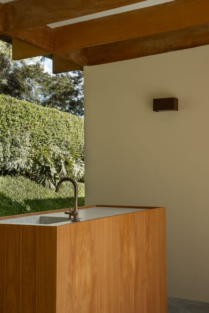 Có thể thông suốt trong dự án là gạch Sàn bê tông lạnh hơn ở khu bên ngoài tương phản với gạch và gỗ Tauarí, được sử dụng trong cấu hình và mộc nghề. Là một không gian có kiến trúc gọn gàng hơn, không có nhiều yếu tố, việc thực hiện nghề mộc bổ sung vào sản phẩm cuối cùng với các chi tiết khác biệt so với thông thường như thanh gỗ, tay cầm bằng thép corten và các lĩnh vực được thiết kế là rất quan trọng. Loại thép corten tương tự này kết nối với các loại kim loại lớn có trong các khu vực ẩm ướt của dự án, nhằm mang lại vẻ ngoài mộc mạc hơn, cùng với mặt bàn đá Granite trắng Itaúnas. Cuối cùng, cảnh quan từ đầu đến cuối cùng trên toàn bộ mặt tiền phía sau của nhà khách, ngoài sự riêng tư, còn mang lại màu xanh tự nhiên và thiên nhiên bên trong môi trường, được bao quanh bởi thảm thực vật .