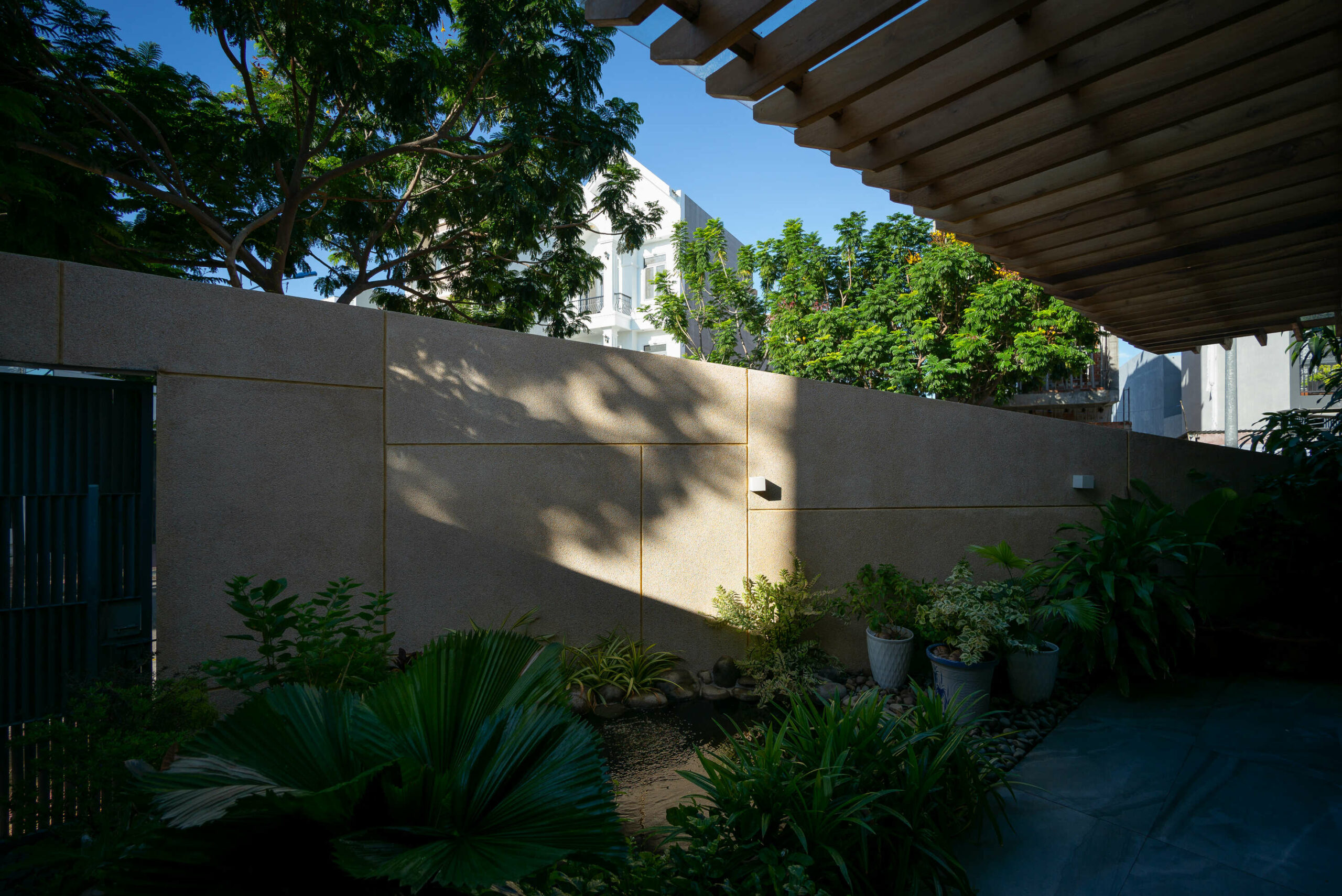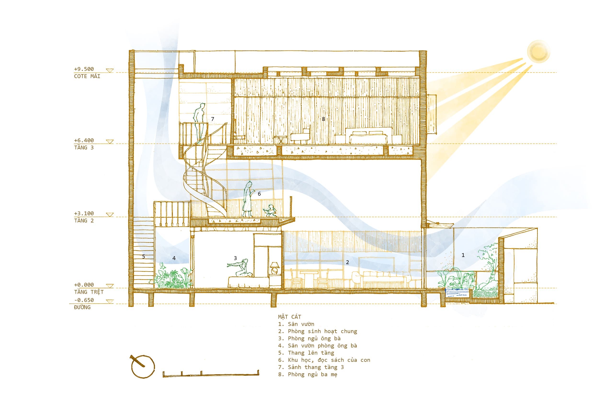 Sân trong đặt ở trung tâm như trục sống của ngôi nhà. Là nơi kết nối ba thế hệ, tạo ra những khoảnh khắc gặp gỡ tự nhiên và thư giãn. Các ban công và vườn nhỏ được bố trí hợp lý để che chắn nắng và giảm nhiệt độ lan tỏa vào không gian bên trong, các “cửa sổ xanh”mang thiên nhiên gần hơn với đời sống hằng ngày và giúp cảm nhận được nhịp điệu của gió, ánh sáng và cảnh quan xung quanh.