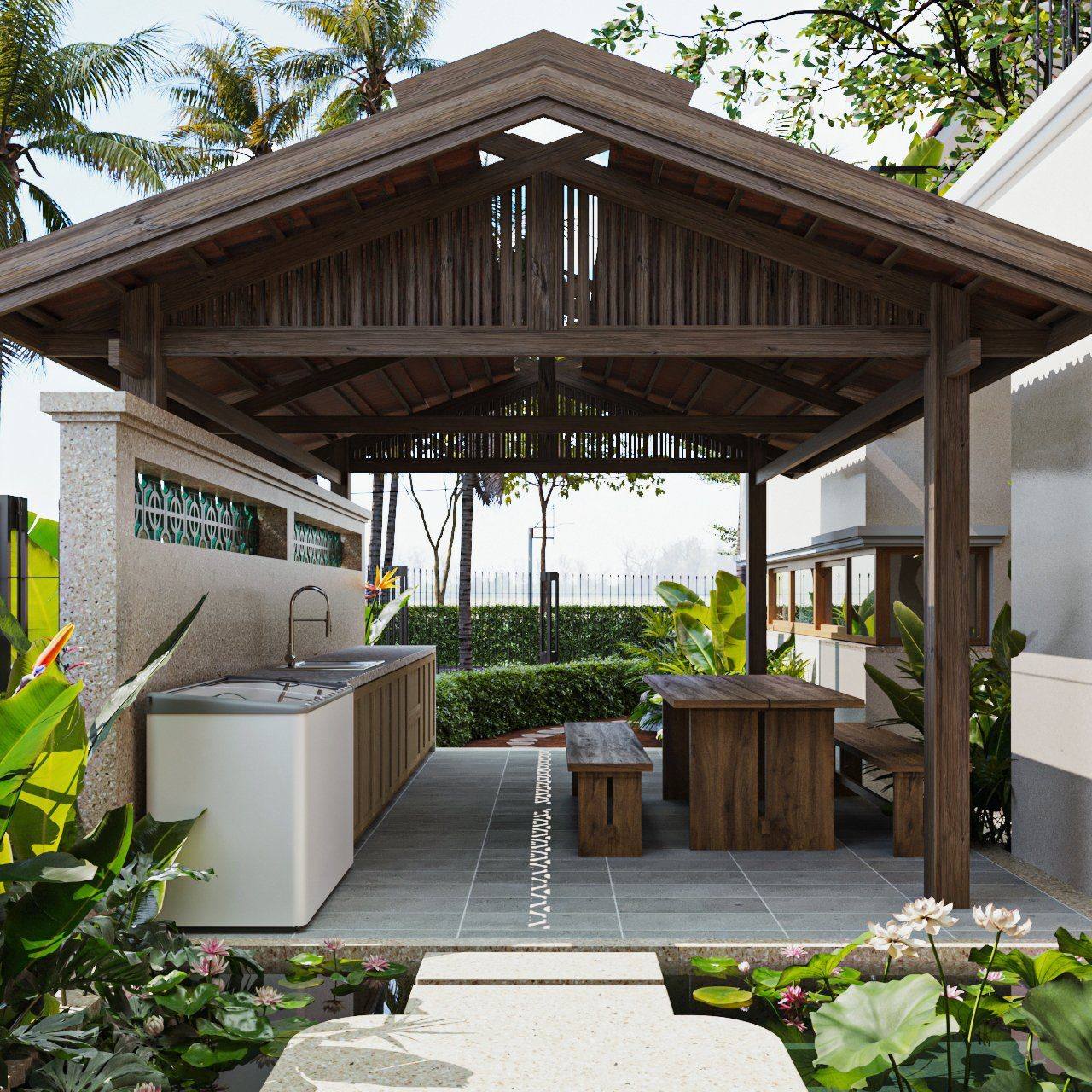 Bao quanh công trình là lớp xanh của cây cối, hồ nước nhỏ điều hòa khí hậu, mang lại cảm giác mát lành. Vật liệu gỗ và đá mộc được lựa chọn để giữ lại nét giản dị, nhưng được xử lý tinh gọn để phù hợp với phong cách sống đương đại.