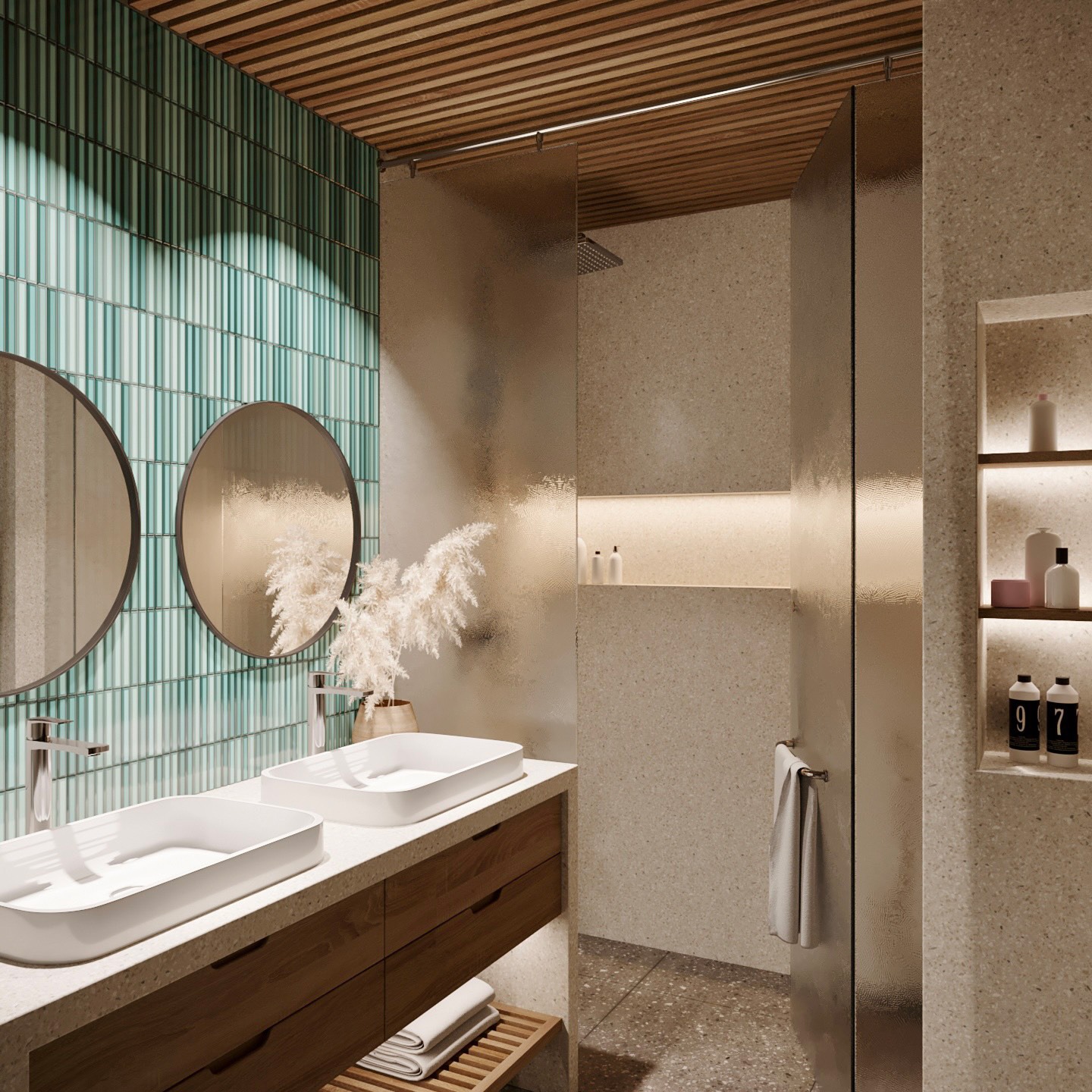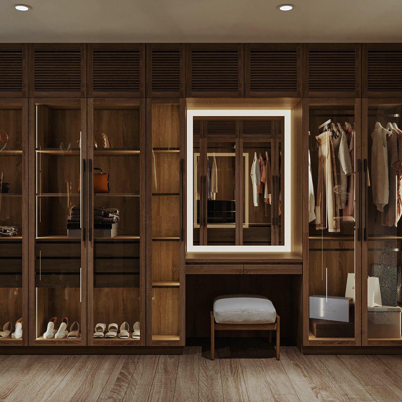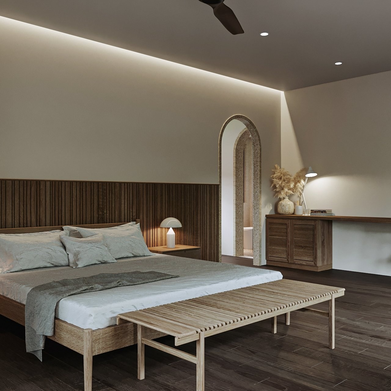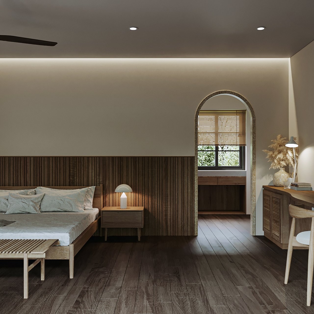 Phòng ngủ và phòng tắm được thiết kế tối giản, ngập sáng tự nhiên, mang đến sự thư giãn và riêng tư. Phòng thay đồ và các không gian tiện ích được xử lý kín đáo, liền mạch trong tổng thể, đảm bảo sự tiện nghi nhưng không phá vỡ tinh thần mộc mạc của công trình.