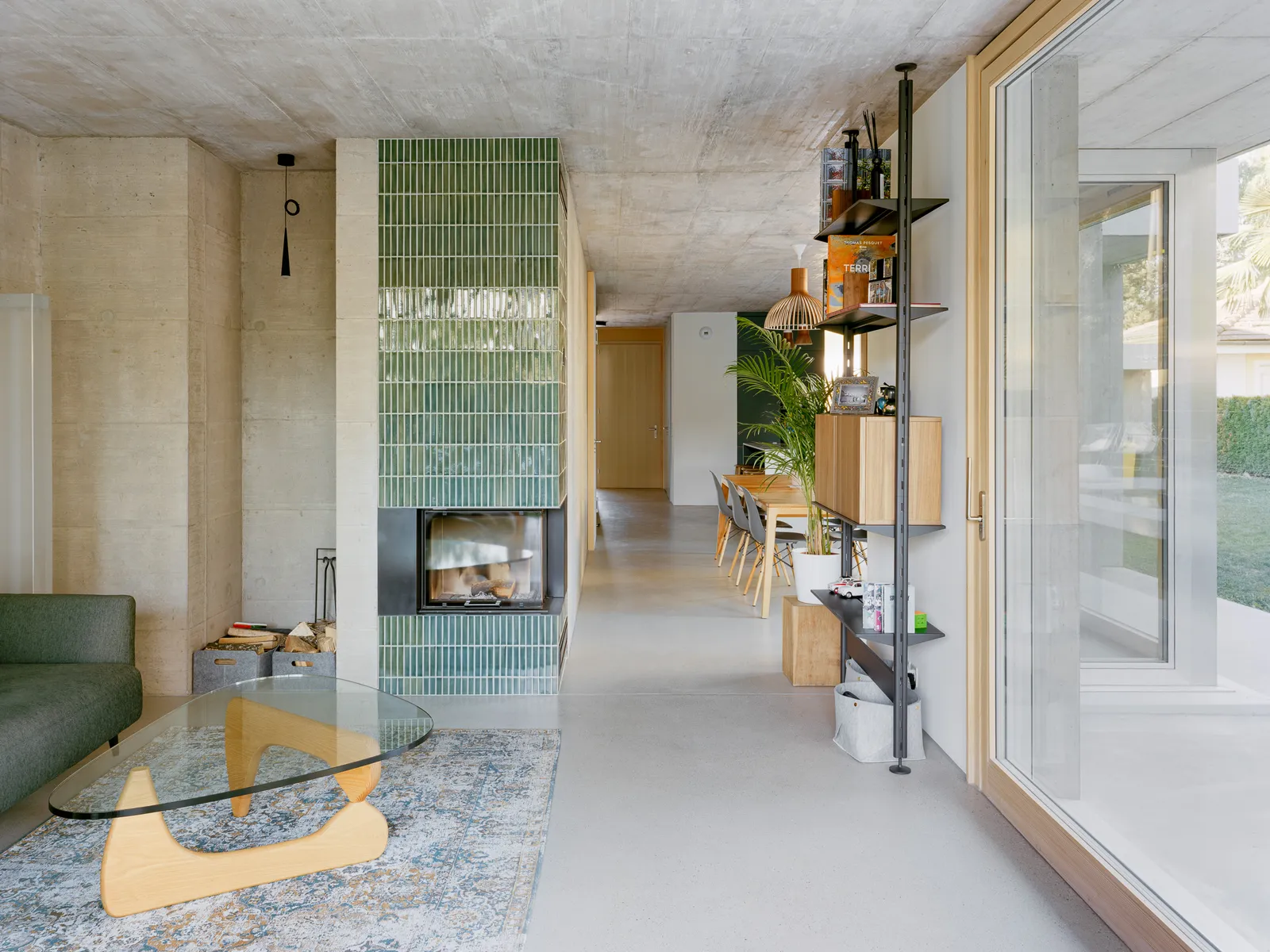 Tầng trệt được thiết kế như một dải không gian liền mạch, kết nối sảnh, bếp, phòng ăn và phòng khách – đặc trưng cho phong cách thiết kế biệt thự hiện đại của Lacroix Chessex Architectes, Mục tiêu là tối ưu hóa ánh sáng tự nhiên xuyên suốt cả ngày, đồng thời tạo nên không gian mở thông thoáng – nơi sinh hoạt gia đình diễn ra trong sự liên kết hài hòa giữa các chức năng.