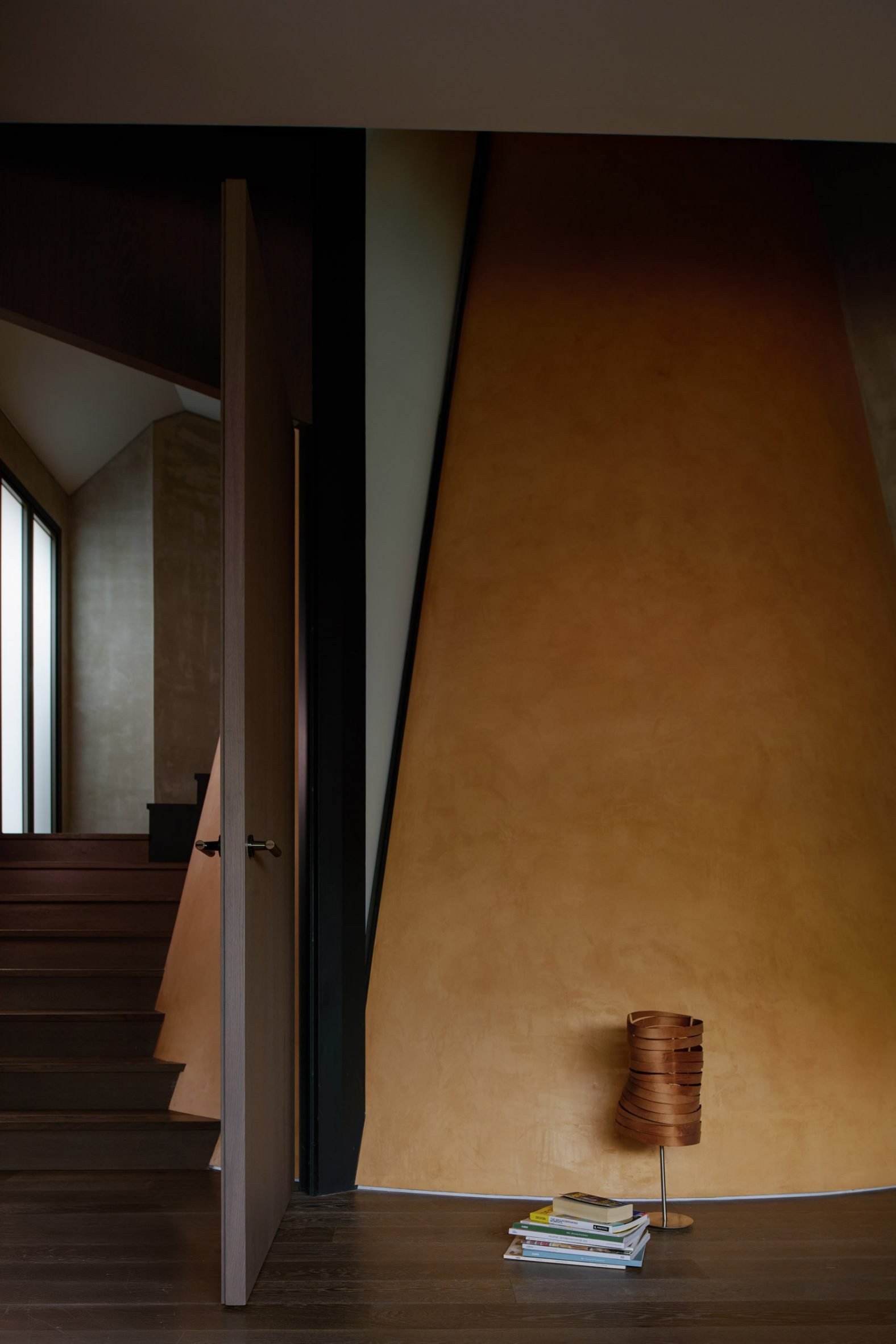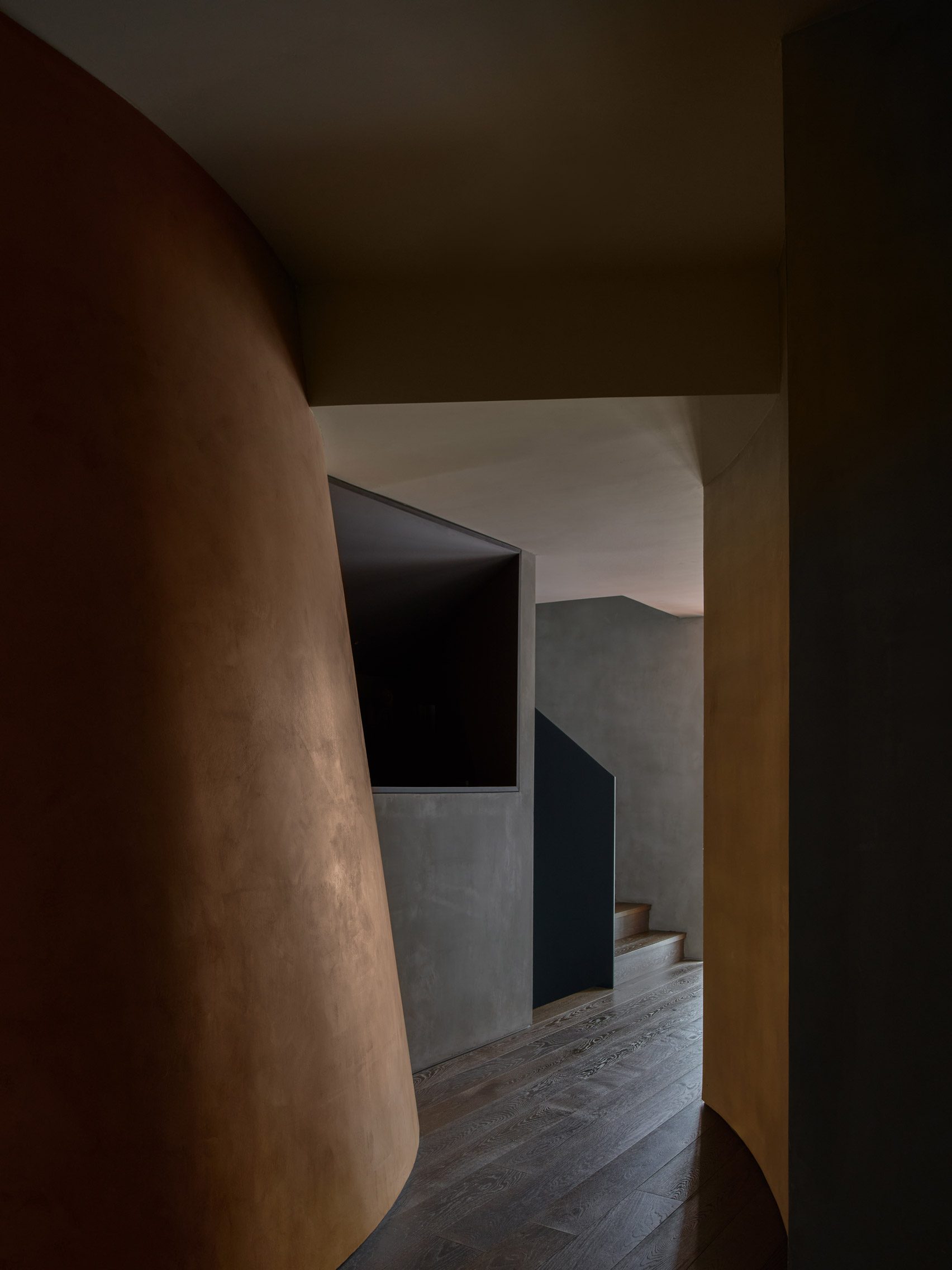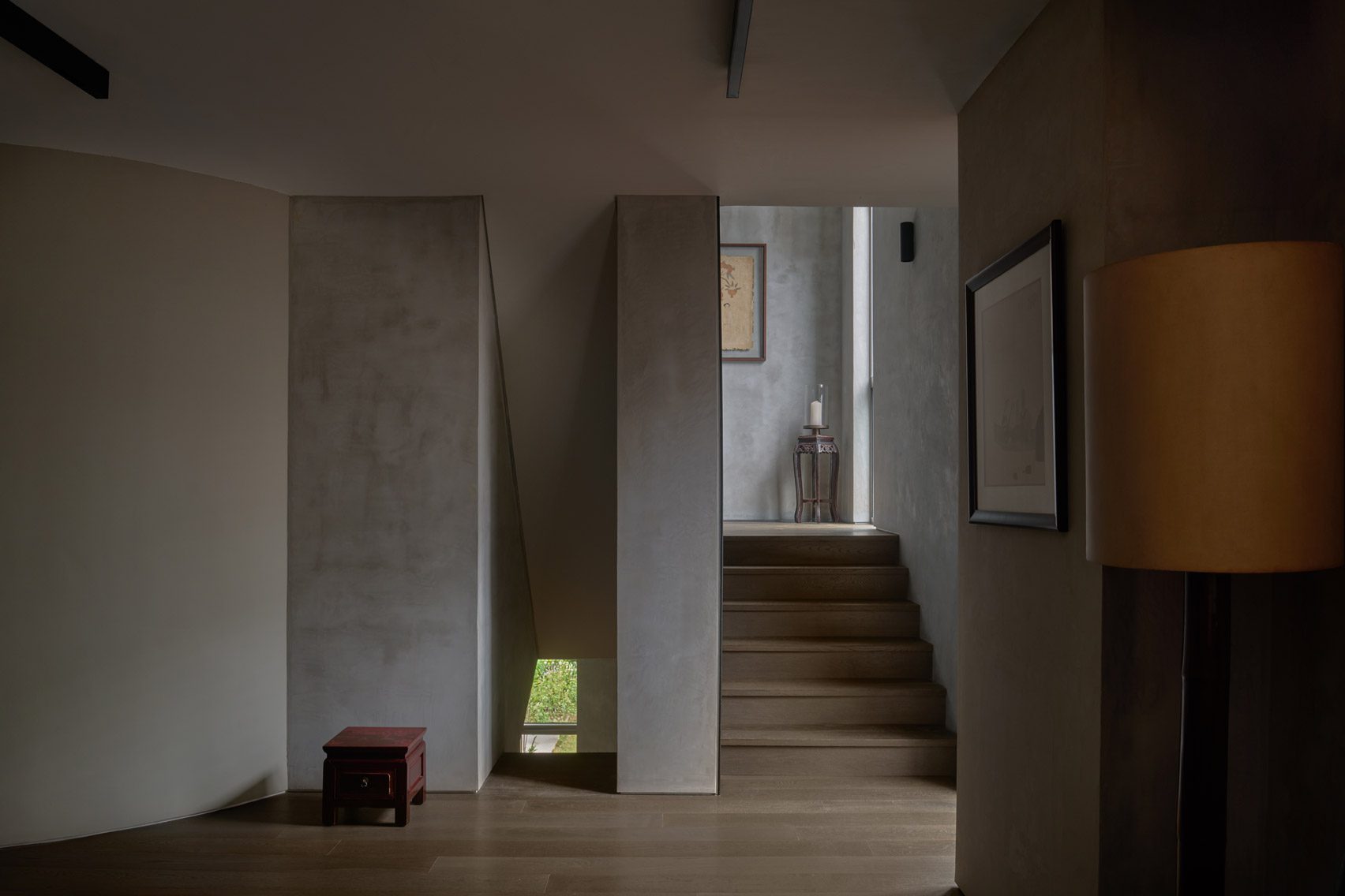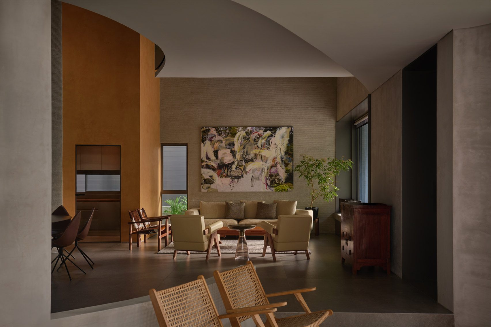 Khoảng trống oculus trung tâm – trái tim của ngôi nhà, nơi ánh sáng tự nhiên xuyên xuống tầng trệt và lan tỏa khắp bốn tầng. Thiết kế này vừa tạo điểm nhấn điêu khắc, vừa hoạt động như hệ thống làm mát thụ động, dẫn luồng khí nóng lên và thoát ra qua quạt ẩn trên mái.