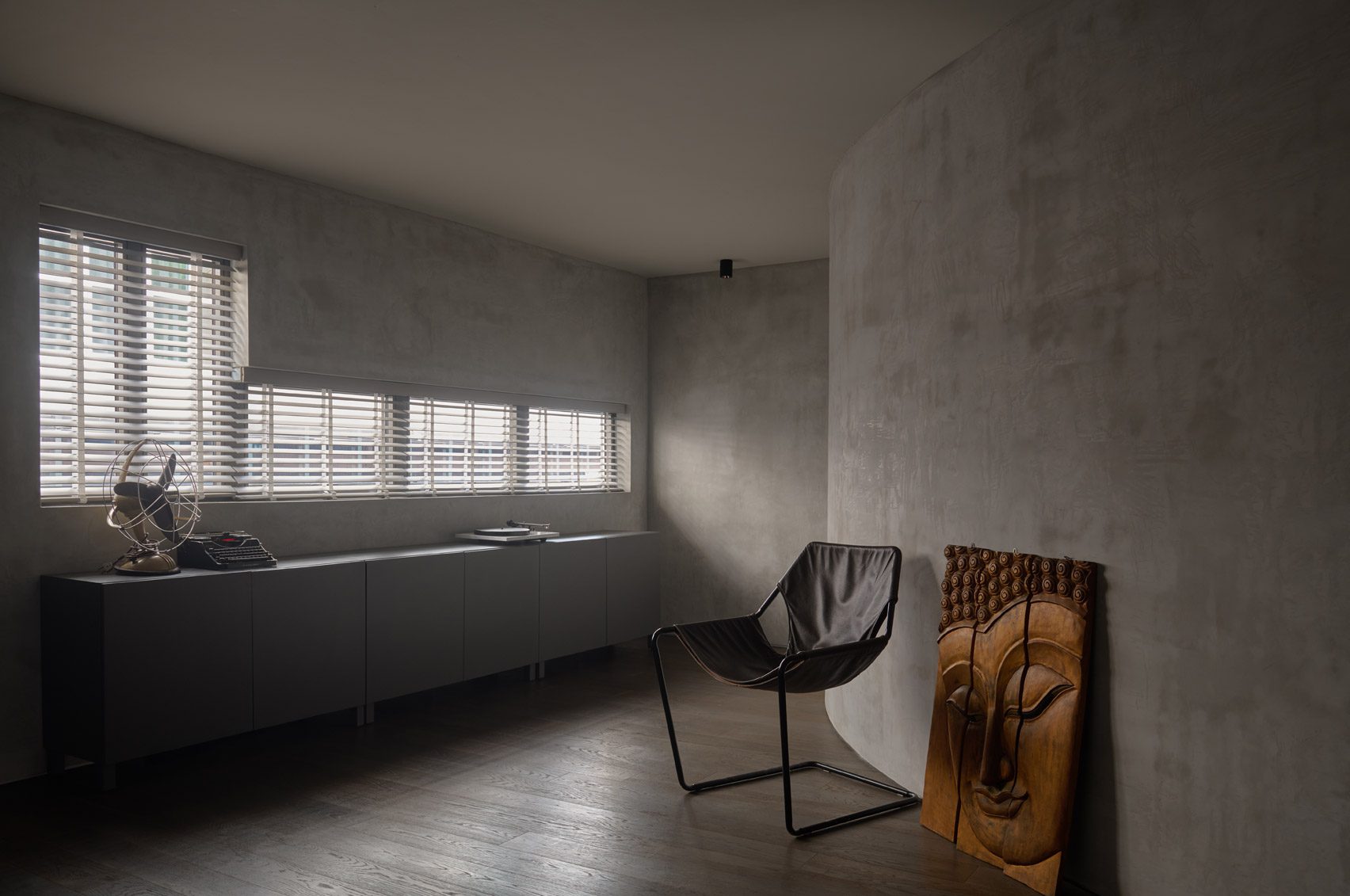 Không gian sinh hoạt chính – phòng khách, bếp và bàn ăn – kết nối dưới ánh sáng tự nhiên từ giếng trời trung tâm. Phòng ngủ và khu sinh hoạt riêng, với các khe cửa sổ hẹp dài giúp giữ sự riêng tư và giảm hấp thụ nhiệt. Phòng làm việc và phòng ngủ chính, mở ra sân thượng xanh với tầm nhìn hướng phố.