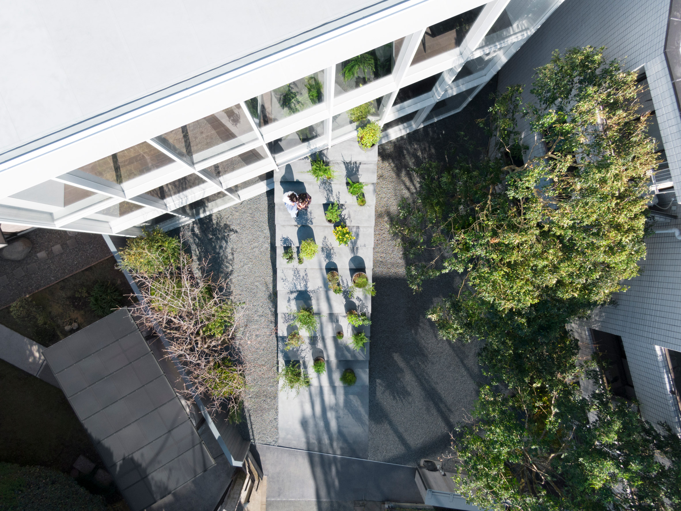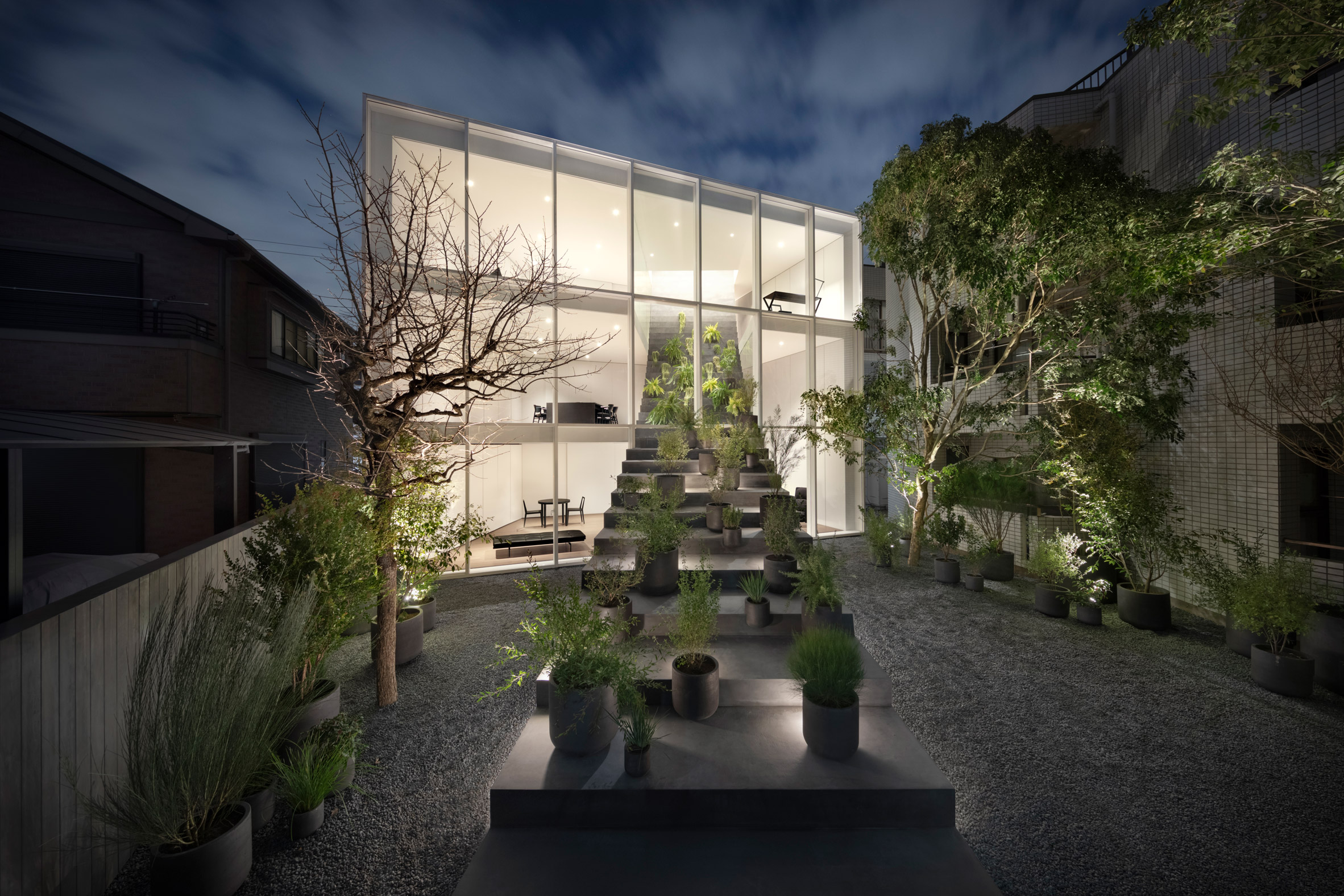 Cầu thang kéo dài liên tục từ khu vườn phía sau, xuyên qua mặt đứng kính và vươn lên tầng trên cùng, tạo cảm giác công trình như được “xếp lớp” bởi các bậc thang.
