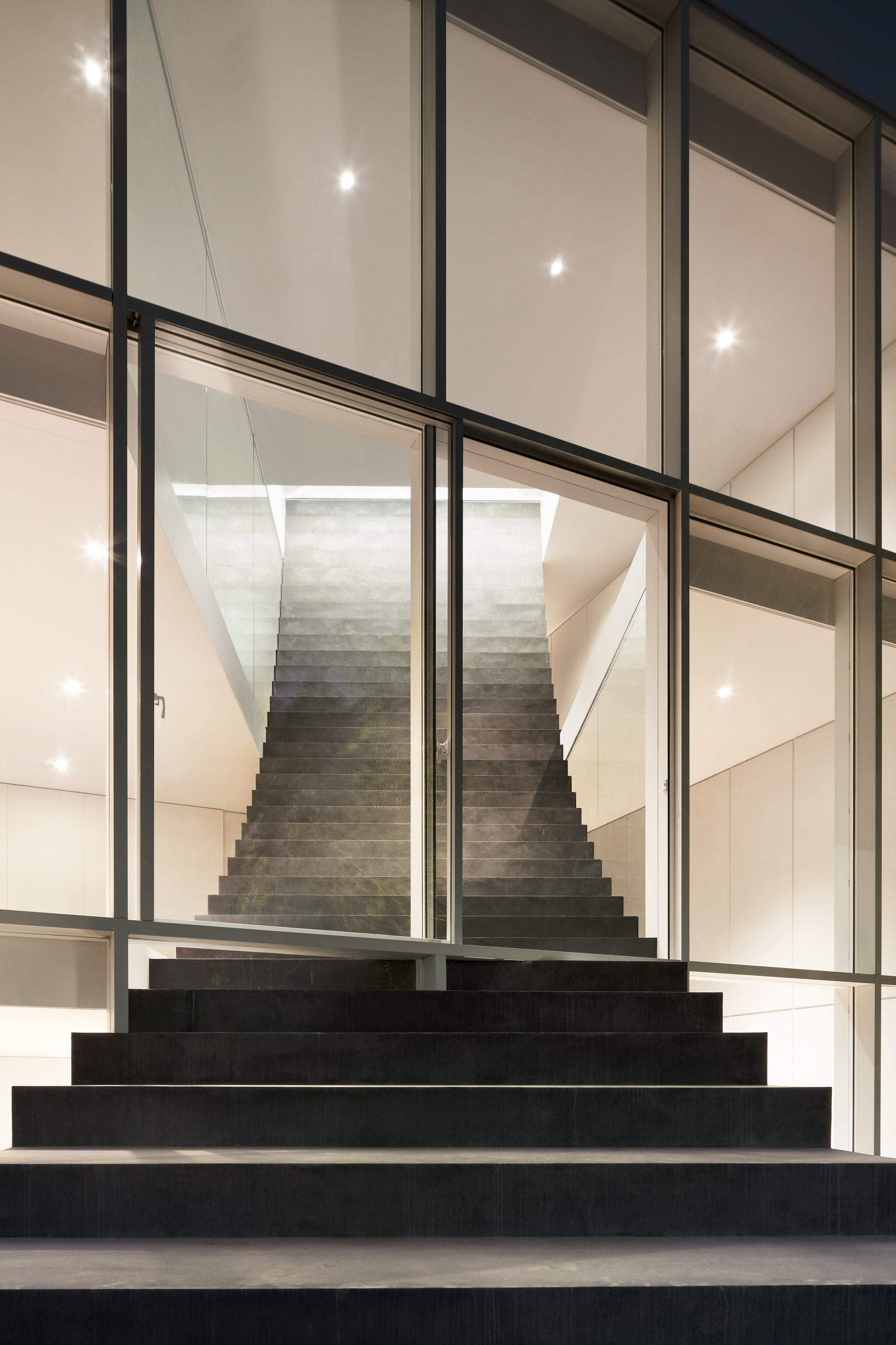 Cầu thang giả bằng bê tông và thép cắt xuyên mặt đứng kính | Ảnh: Dezeen.