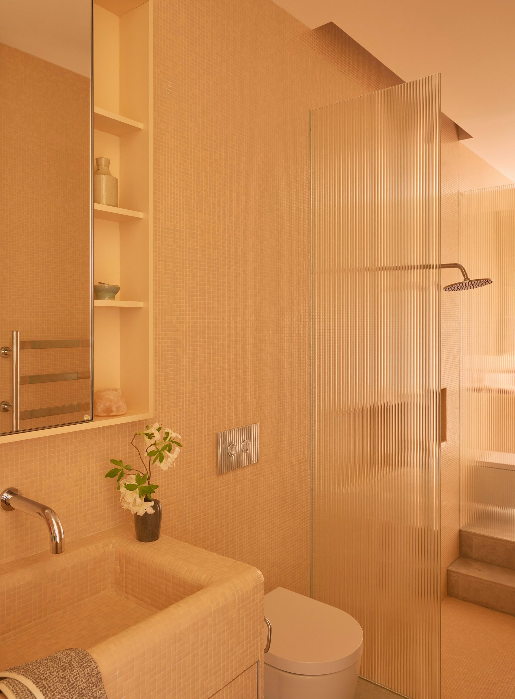 Các phòng tắm của Temple House được xử lý như những không gian tĩnh lặng, nơi ánh sáng, vật liệu và tỷ lệ được tiết chế tối đa. Chính cách tiếp cận này đã giúp khu vực phòng tắm của công trình được đề cử tại Dezeen Awards 2025.