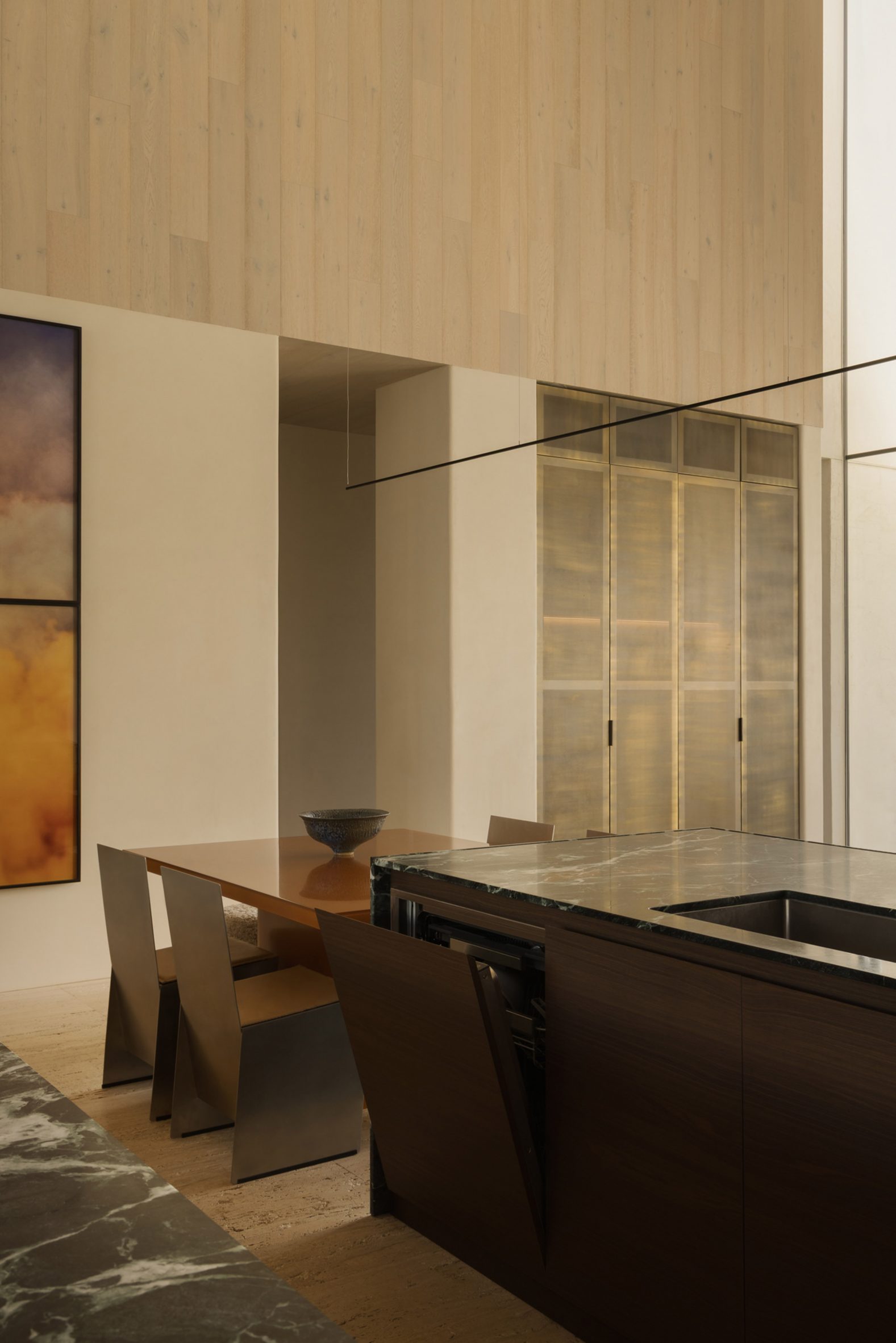 Không gian nội thất được tổ chức xoay quanh gian bếp đá cẩm thạch xanh – điểm nhấn thị giác của toàn bộ ngôi nhà. Gỗ sáng màu, kim loại và đá tự nhiên được kết hợp nhằm làm mềm cảm giác thô mộc của kiến trúc nguyên khối.