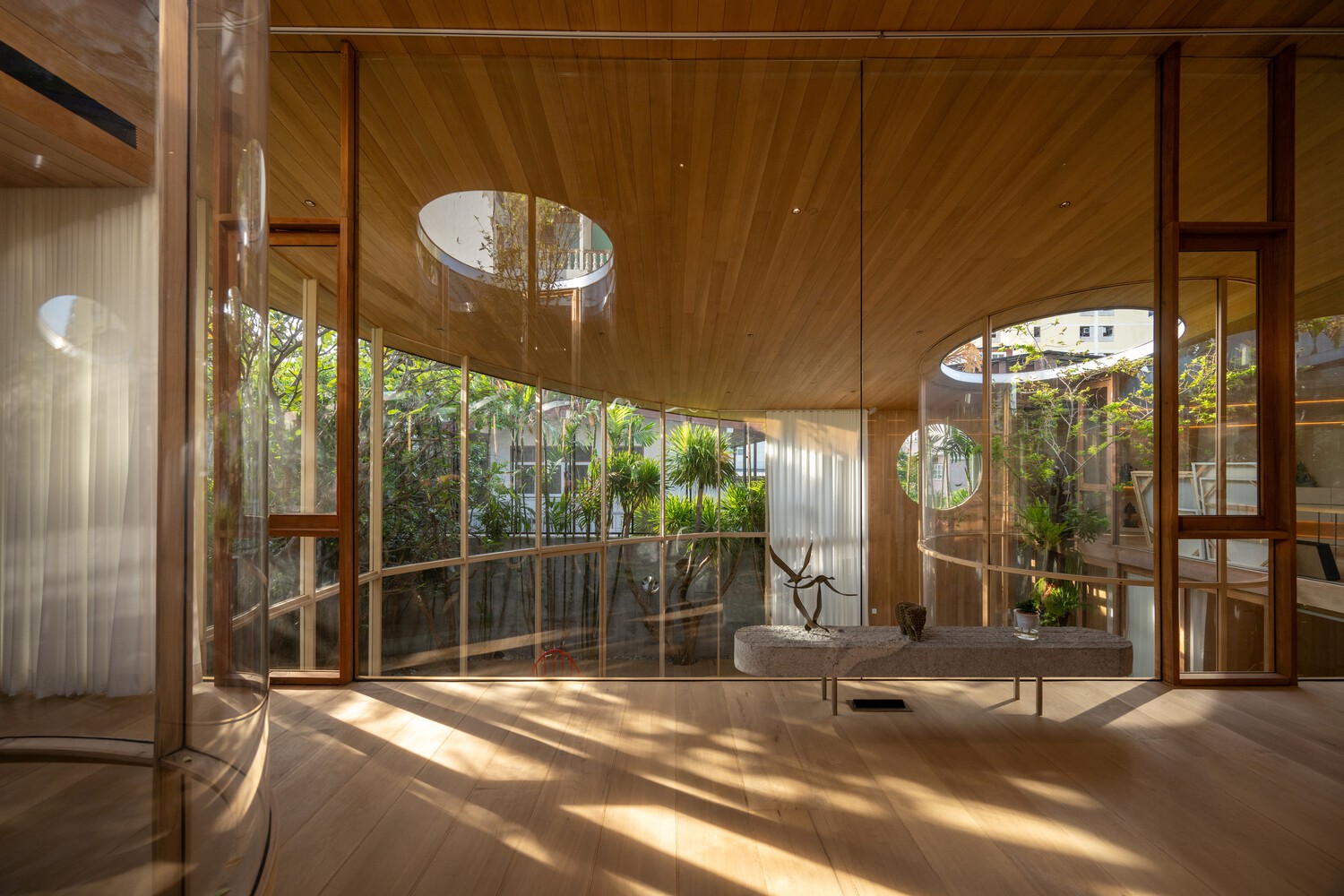 Trái tim của Terrarium House là sân trong trung tâm – một “terrarium” - hệ sinh thái thu nhỏ đúng nghĩa, nơi các cây hiện hữu trên khu đất được giữ lại và bao bọc bởi hệ kính cong trong suốt. Ánh sáng tự nhiên được lọc qua tán lá, tạo nên những mảng đổ bóng chuyển động liên tục trên trần và sàn gỗ, khiến không gian thay đổi theo từng thời điểm trong ngày.