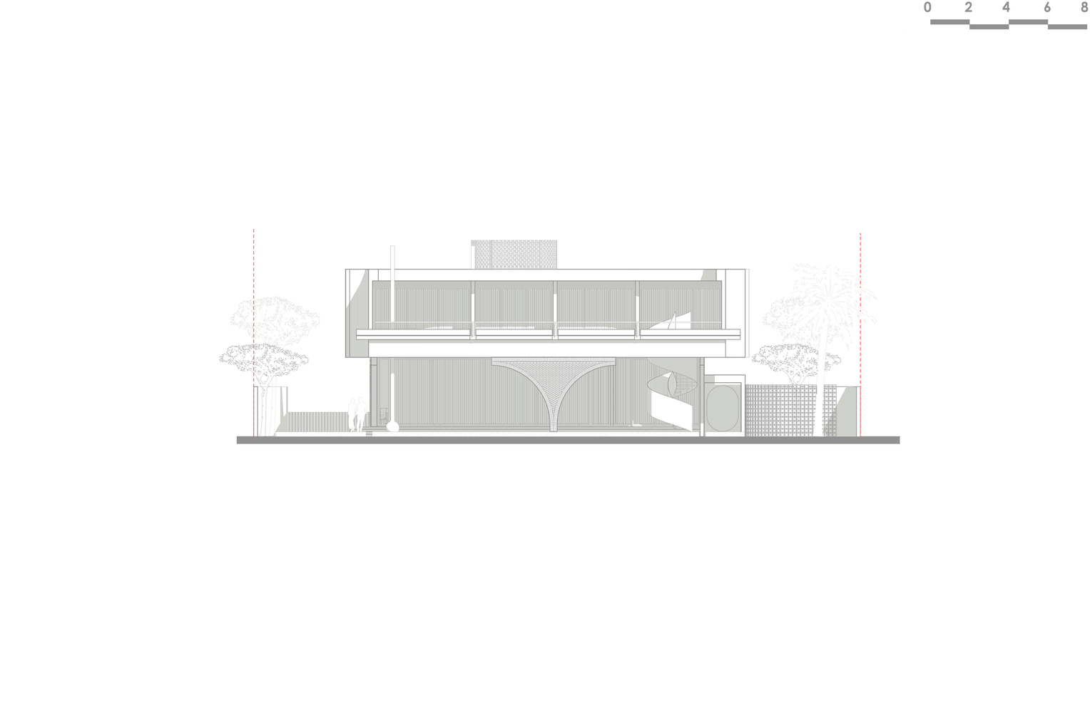Từ mặt tiền, công trình gây ấn tượng bởi vẻ kín đáo và tĩnh mịch. Những khe sáng được tạo nên bởi hệ lam gạch terracotta mảnh, vừa giúp giảm nắng gắt phương Tây, vừa tạo nên nhịp điệu ánh sáng thay đổi suốt ngày.Lối vào chính nằm giữa hai mảng tường cong – một “đường biên mềm” dẫn dắt bước chân vào không gian yên ả bên trong.