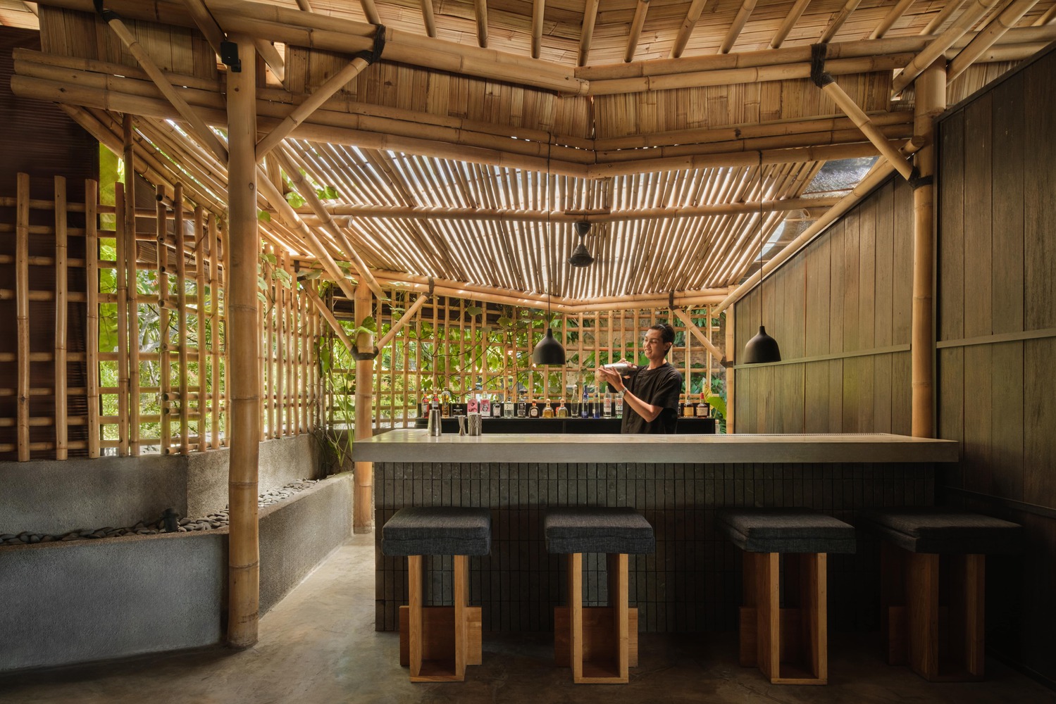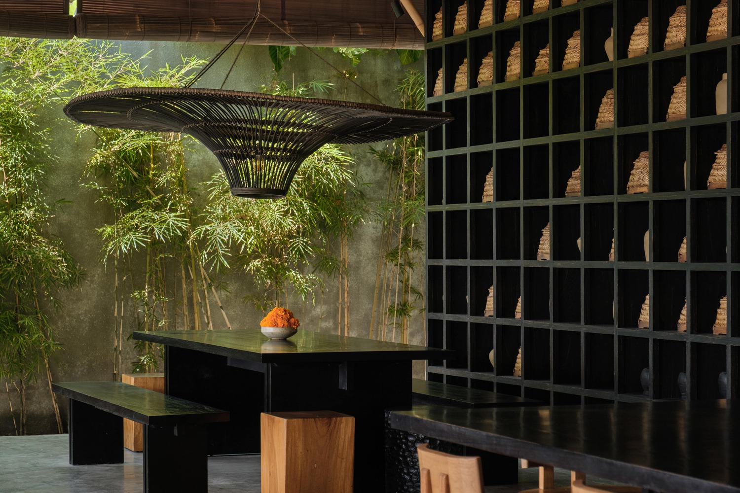 Sử dụng vật liệu bản địa: Tre vàng địa phương mang sự bền vững và mềm mại, trong khi đá núi lửa thô mộc tạo chiều sâu xúc giác. Hai vật liệu nói bằng “ngôn ngữ của Uluwatu”, giúp công trình hòa nhịp với địa hình và khí hậu. Nội thất & ánh sáng: Gỗ đen tạo chiều sâu, tre vàng giữ sự ấm áp. Ánh sáng được làm dịu tối đa, tái hiện chất Izakaya thân mật và chậm rãi. Mỗi chi tiết đều hướng đến trải nghiệm ấm áp, tinh tế và đầy cảm xúc.