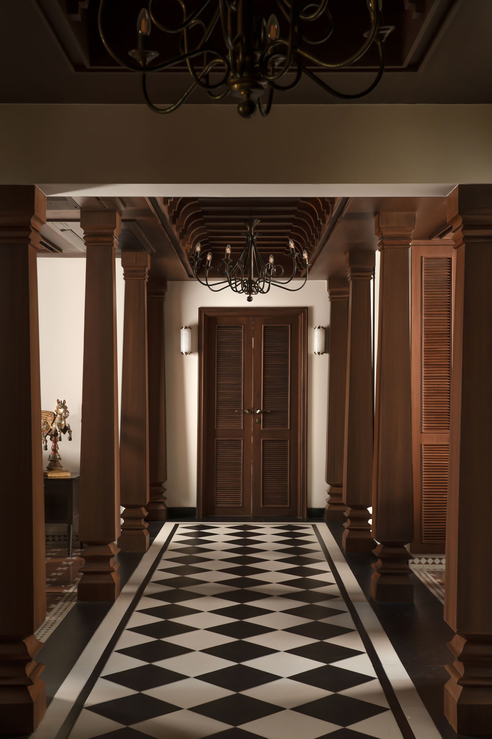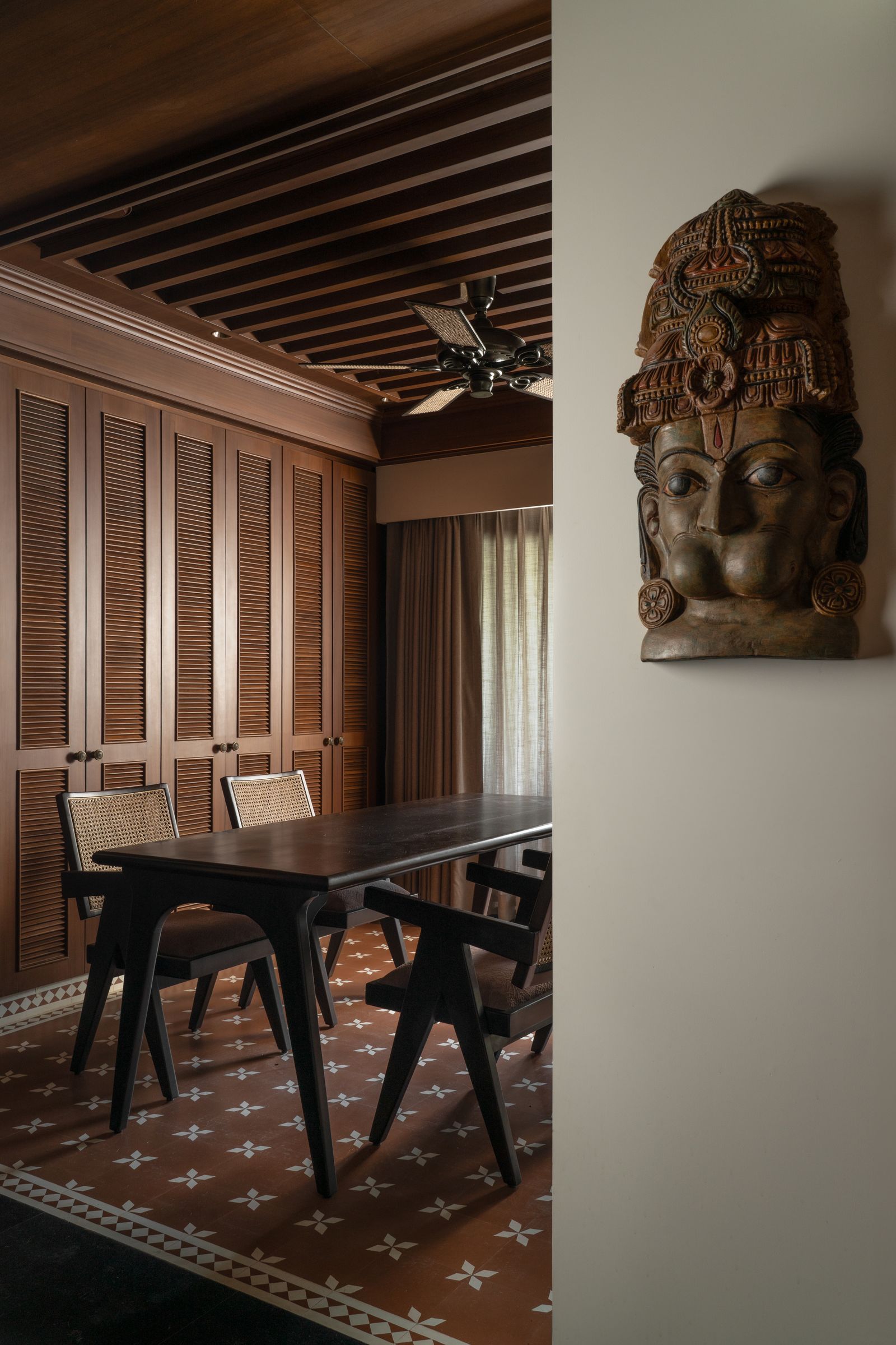 Với ý tưởng một ngôi nhà với gỗ, cột trụ và nghệ thuật Gond (dòng tranh dân gian truyền thống của Ấn Độ) xuất hiện khắp không gian. Lựa chọn “dệt văn hóa vào từng góc nhỏ” – từ cột gỗ được xử lý thủ công, đến đồ gốm Rajasthan, mặt nạ cổ, tượng gỗ sưu tầm từ Kochi và Mumbai. Để mang đến một ngôi nhà Ấn Độ truyền thống – ấm cúng, gần gũi, nhưng vẫn mở ra sự hiện đại trong ánh sáng và không gian.